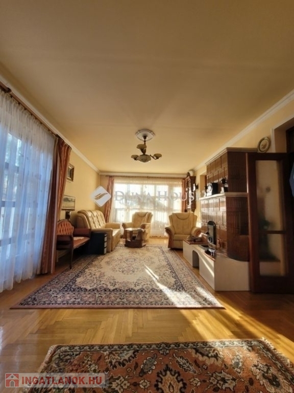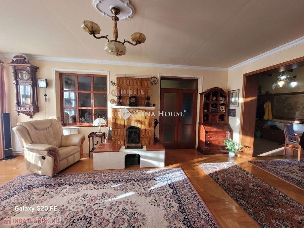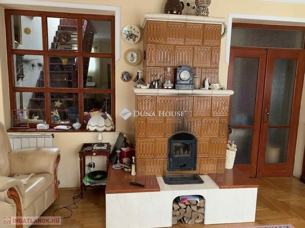 A nappali ékköve egy klasszikus vonalvezetésű, stílusos cserépkályha, mely nemcsak a téli esték hangulatát emeli új szintre, hanem valódi dekorációs központi elem is az enteriőr fókuszpontja. Az étkező fölötti 4,5 méteres belmagasság drámai tágasságérzetet ad, amit a nagyméretű, hő- és hangszigetelt nyílászárók tesznek még látványosabbá: a természetes fény szinte festményként rajzolja át a padlót egész nap.