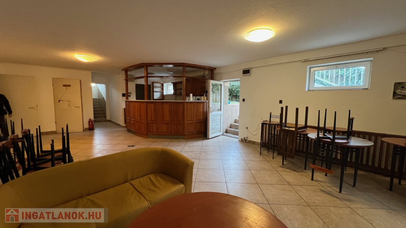 Szuterénben 1 db 5fős szoba plusz egy 60m2-es társalgó, konyha, ebédlő,1 fürdő, 3Wc.