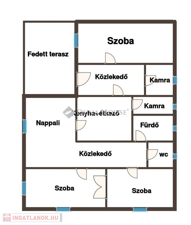 Főépület: 4 szoba, konyha+étkező, 2 kamra, közlekedő, fürdőszoba, külön wc.