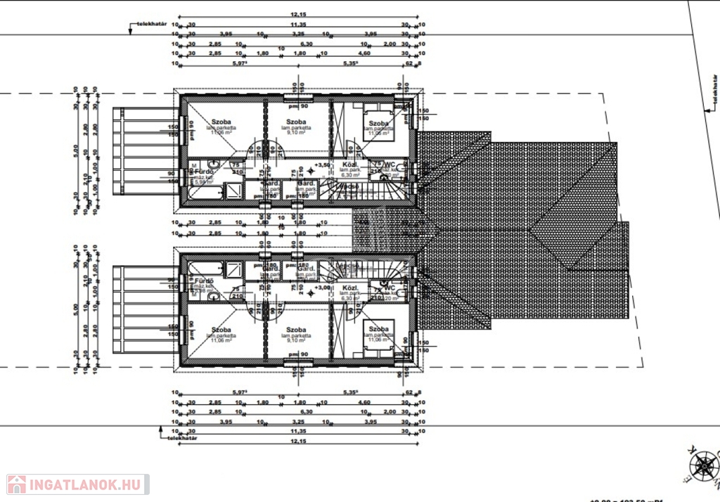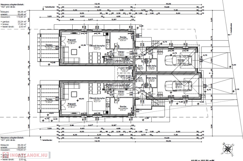Mindkét ikerház fél nettó 120 nm hasznos alapterületű két szintes épület + mindegyikhez tartozik egy-egy garázs és tároló. A házrészek itt kapcsolódnak egymáshoz.