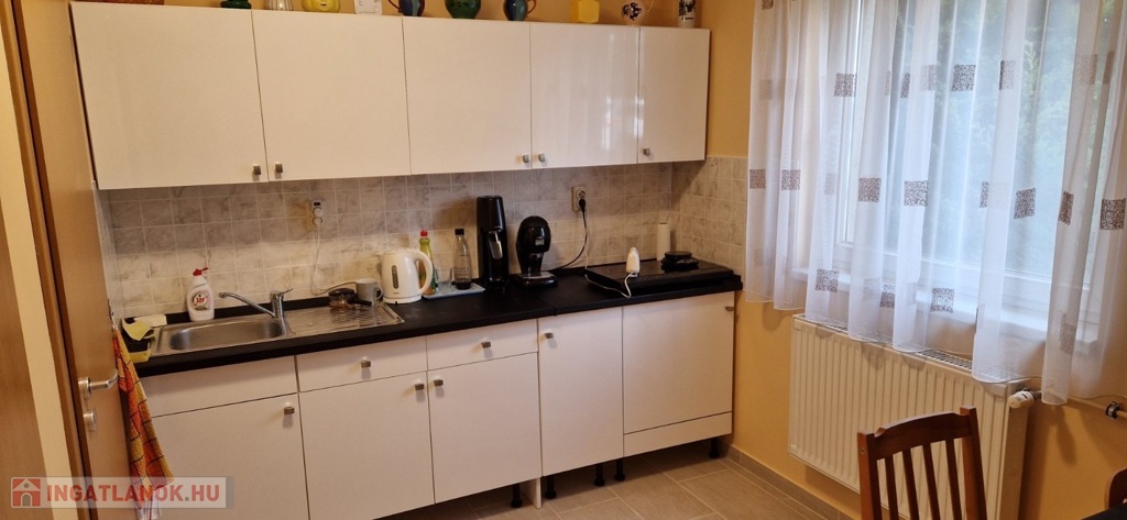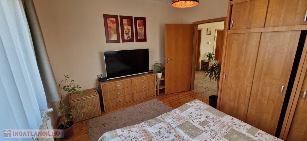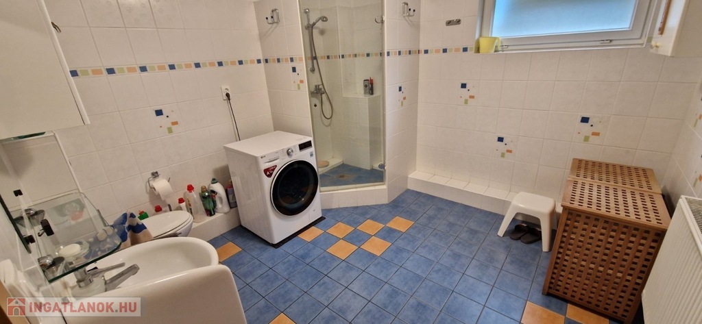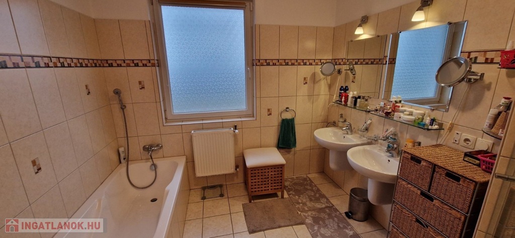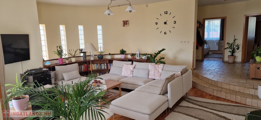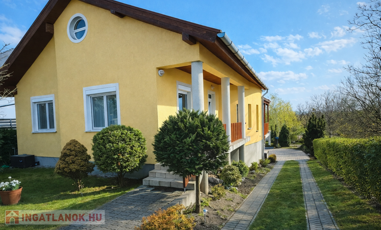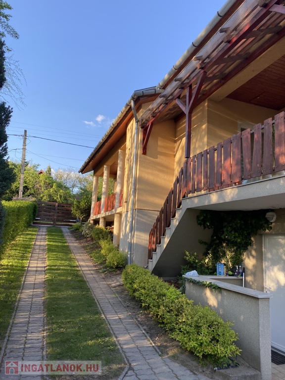 Ingatlan leírása: a szépen karbantartott ház két szinten, 195 nm területü. A földszinten található 3 hálószoba, 1 nagy, világos nappali, 1 gépesített konyha, 1 fürdőszoba (káddal és zuhanyzóval) és 1 különálló WC. A nappaliban hűtő-fűtő klíma és egy kis cserépkályha is található. A félszuterén használható akár önálló lakrészként (idősebb szülő(k) részére, kamasz gyermek részére, aki szeretne egy kicsit önállóan, de mégis a szülők közelében élni, konditeremként, tároló helységeknek, üzletnek, műhelynek, kiadható, stb.) A félszuterén – mely a telek lejtős jellege miatt földszinti, teljes értékű szintnek tekinthető - jelenleg egy szép, világos nappaliból (kétszárnyú, kertre néző ajtókkal), konyhából (teljes értékű, világos ablakkal), fürdőszobából (ablakkal), és 2 tárolásra alkalmas helységből áll. A félszuterén megközelíthető lakáson belülről és kívülről is attól függően, hogy milyen célt szolgál. Jelenleg teljes értékű lakóhelyként funkcionál.