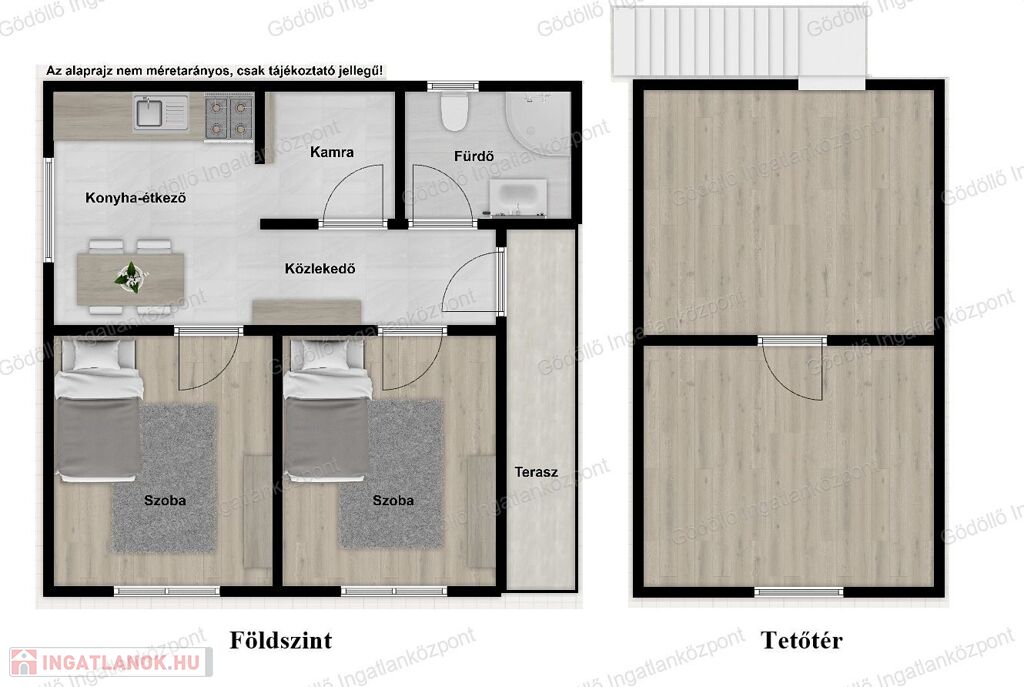 A földszint kb. 34 nm-es, praktikus elosztású: konyha, kamra, két félszoba, fürdő-WC és közlekedő került kialakításra, ill. egy 6nm fedett terasz is tartozik hozzá. Tetőtere emelt szintű készültségű.