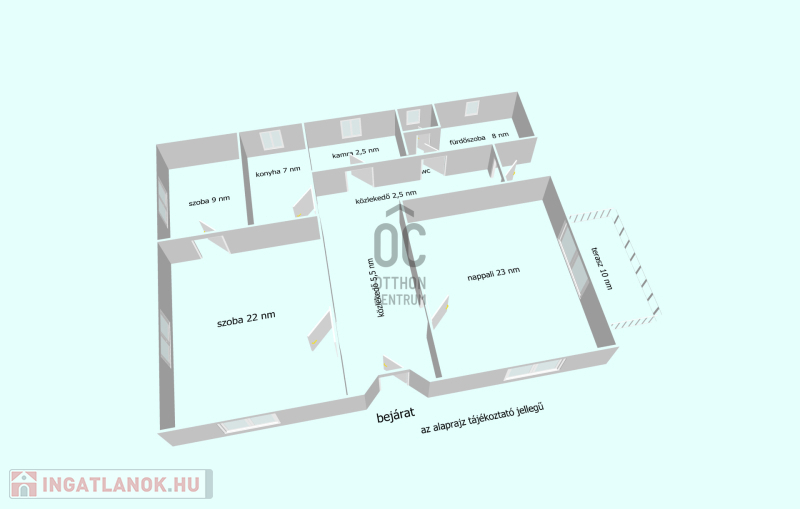 - belső kialakítás: 2 db 23 nm-es tágas, világos szoba, félszoba, konyha+étkező, kamra, közlekedő, zuhanyzós fürdőszoba helyiségekből áll,