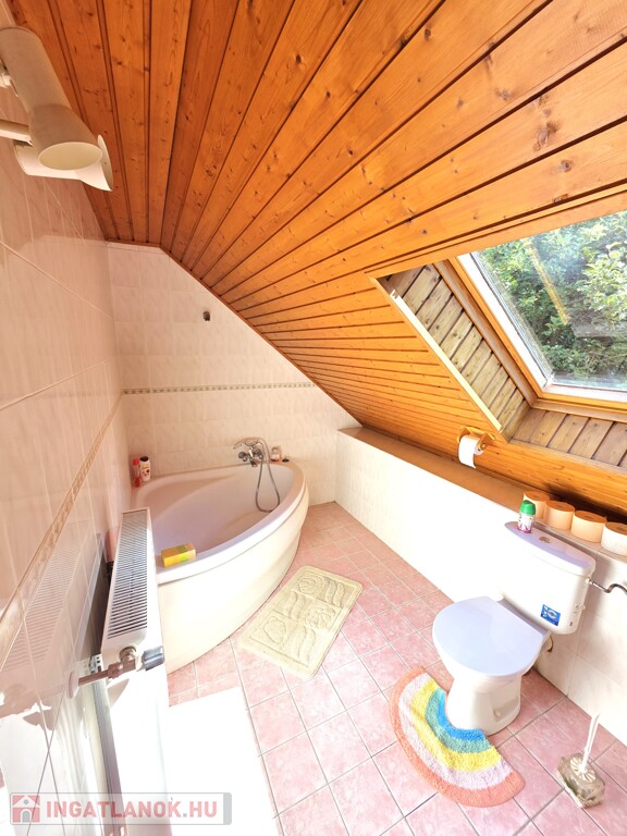 Tetőtér: Tágas nappali, jelentleg itt található a konyha, innen nyílik a fenti hálószoba, onnan pedig a fürdőszoba. Az emeleten található egy igen nagy terasz, ahonnan a kert első és hátsó felébe is lesétálhatunk.