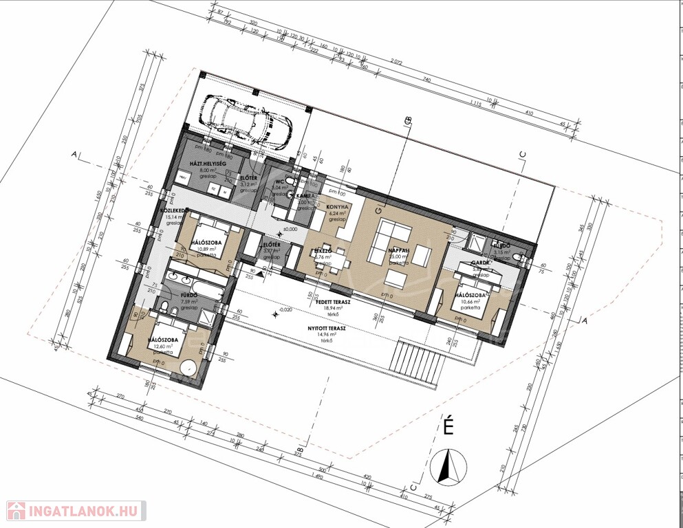 • A telek mérete 797 m2, ennek maximális beépíthetőségét ki is használták. Az ingatlan belső alapterülete 124 m2, és ehhez jön hozzá a 42 m2-es külső terasz, valamint az 1 autónyi kocsibeálló.