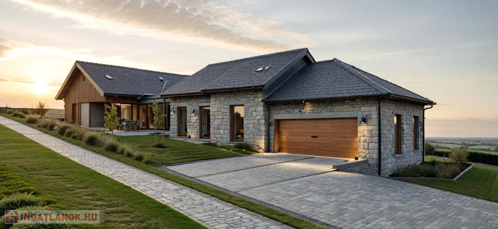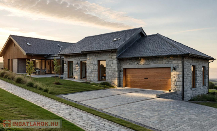 A házhoz tartozó impozáns garázs, elegáns kő- és faelemekkel díszített homlokzat, valamint gondosan megtervezett kert biztosítja a valódi luxus életérzést.