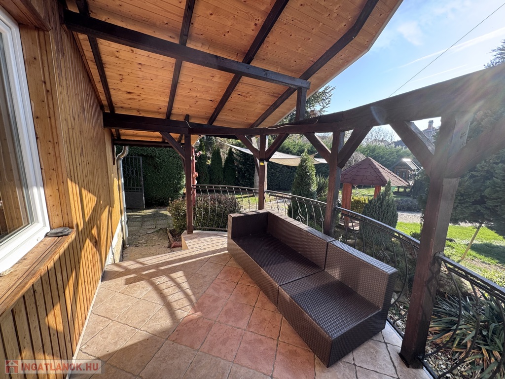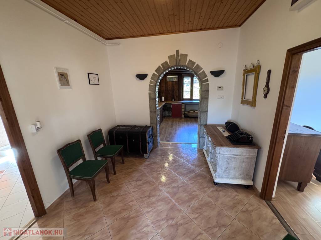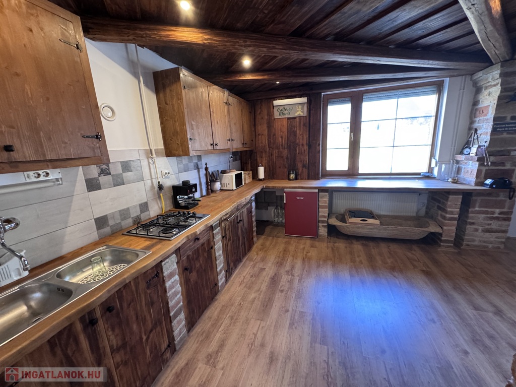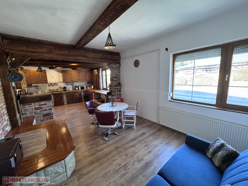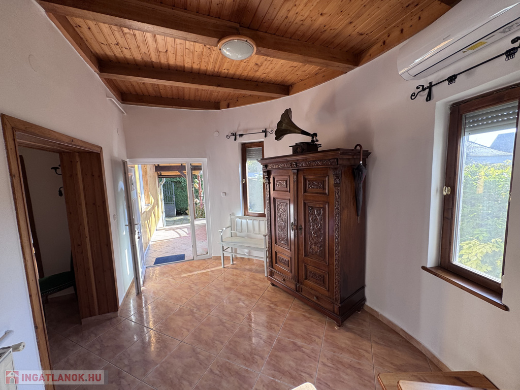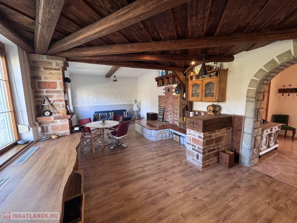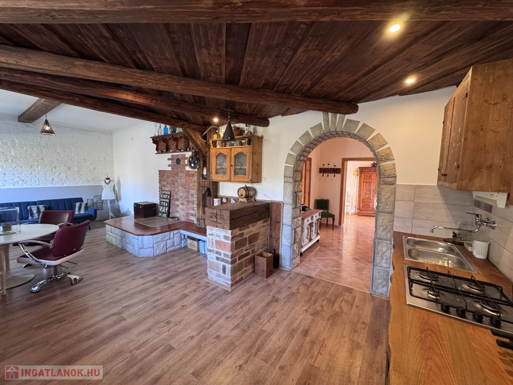 Az ingatlan egyik legszebb éke a nappali impozáns, fagerendás mennyezete, amely egyedi atmoszférát ad a térnek. A téglából épített konyhapult tovább erősíti a mediterrán hangulatot, amely végigkíséri a ház teljes arculatát.