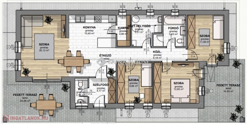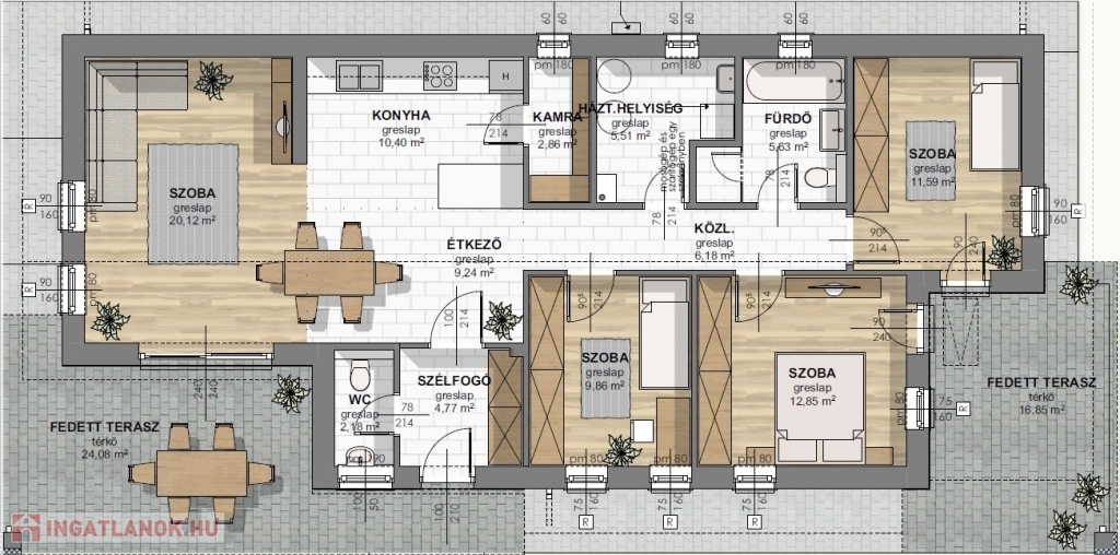 Az ingatlan 3 szoba + nappali elrendezésű, a terasz kellemes lehetőséget biztosít pihenésre, valamint a nappali természetes meghosszabbításaként szolgál a jó időben.