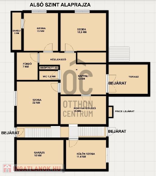 ✔ Alsó szinten: 3 hálószoba, nappali, konyha+étkező, fürdő, WC, 1 különálló szoba, garázs