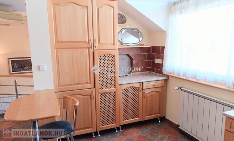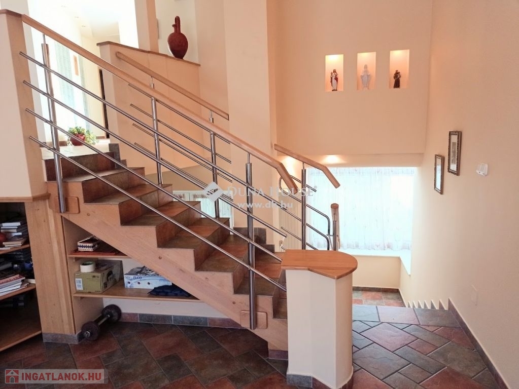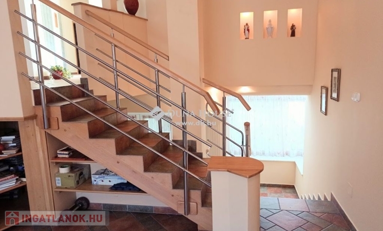 -az emeleti impozáns szinteltolásos lakrészen találunk 3 szobát, gépesített konyhát étkezővel ,nappalit, fürdőt, wc-t, háztartási helyiséget valamint gardróbot