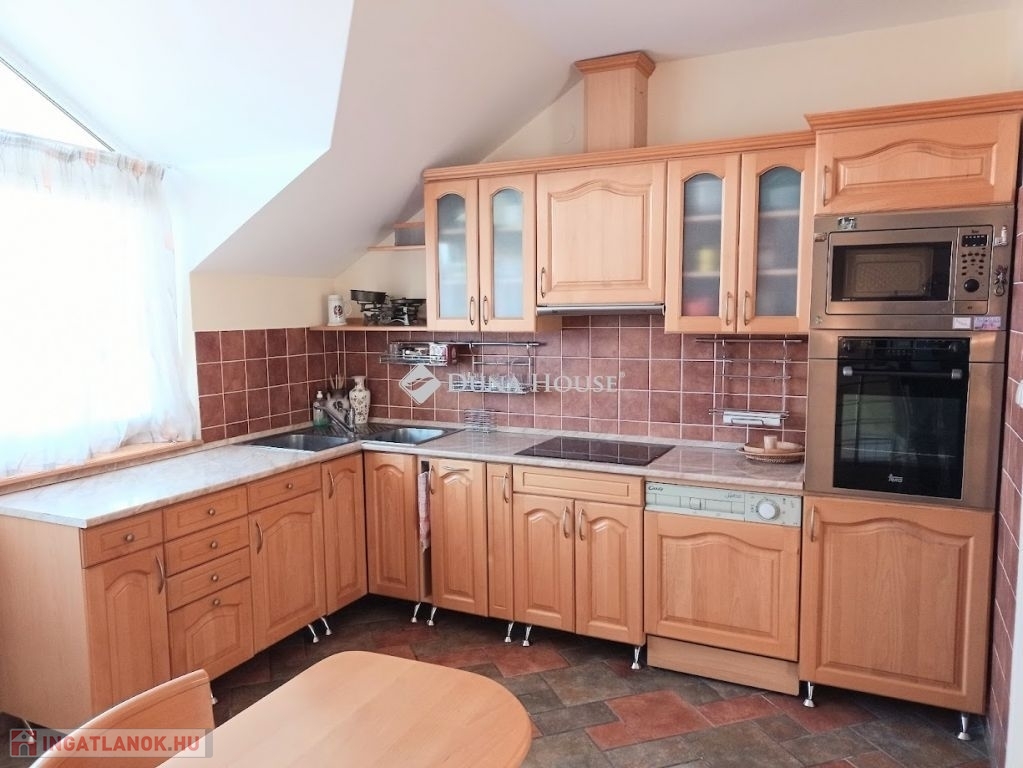 -az emeleti impozáns szinteltolásos lakrészen találunk 3 szobát, gépesített konyhát étkezővel ,nappalit, fürdőt, wc-t, háztartási helyiséget valamint gardróbot