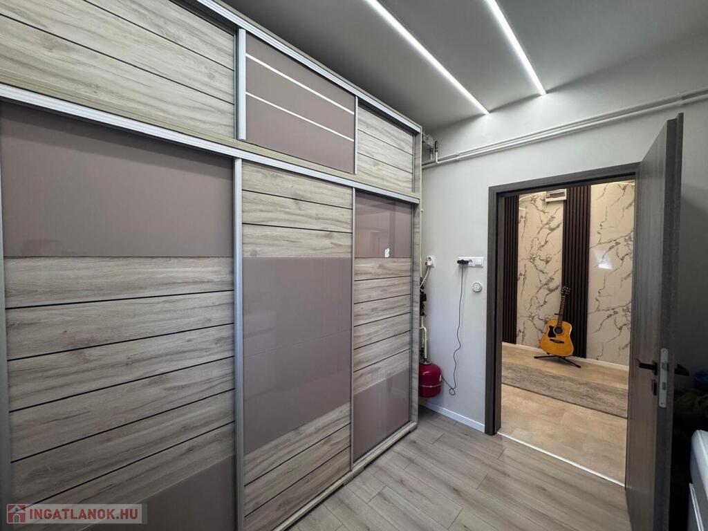 A külön gardrób helyiség új, tolóajtós beépített szekrényekkel még praktikusabbá teszi a mindennapokat.
