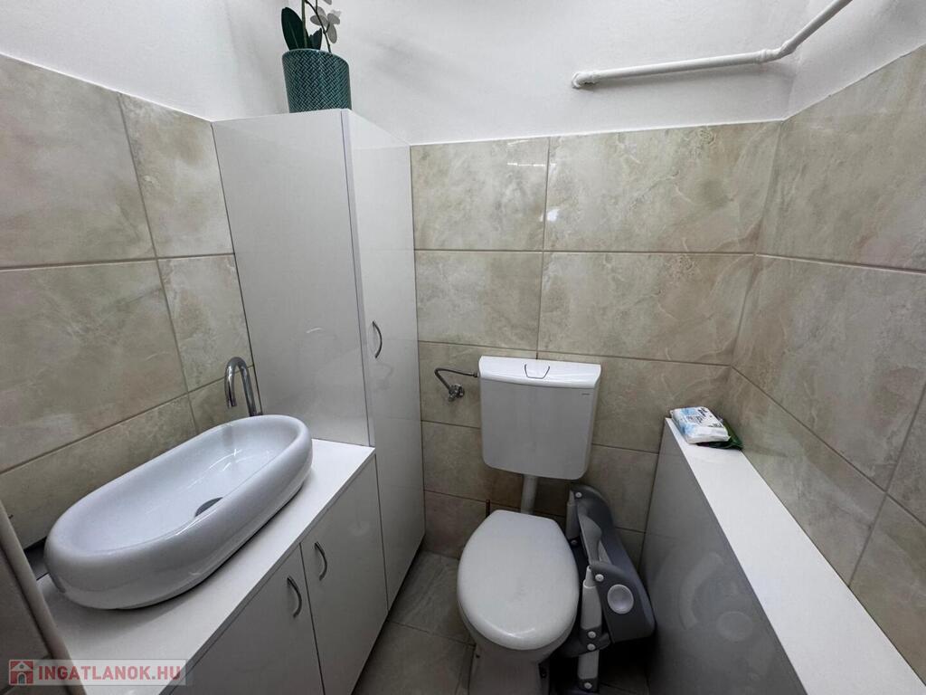 * fürdőszoba, ahol mosdó, WC és kád - zuhanykabinnal is helyet kapott