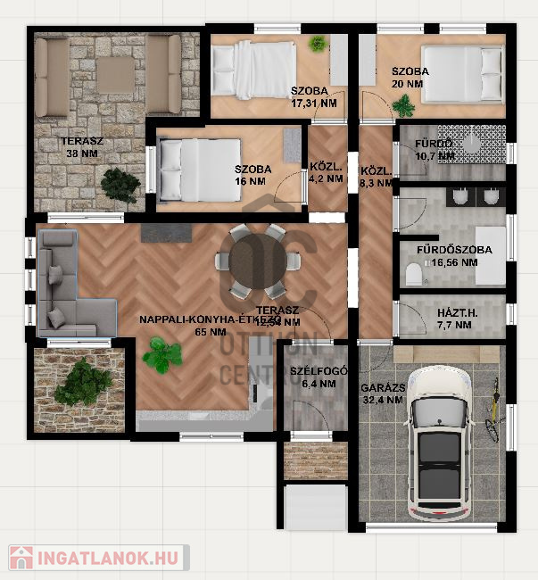 - 3 hálószoba, 65 nm-es nappali-konyha-étkező egy légtérben