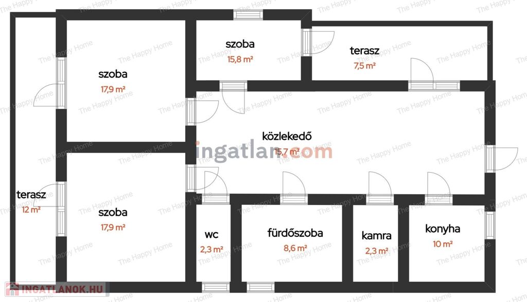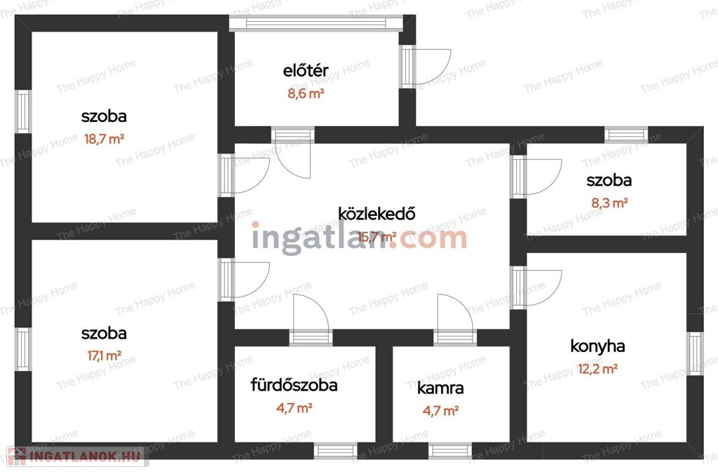 Mindkét szinten 3 külön nyíló szoba, konyha, fürdő, wc, kamra, előtér