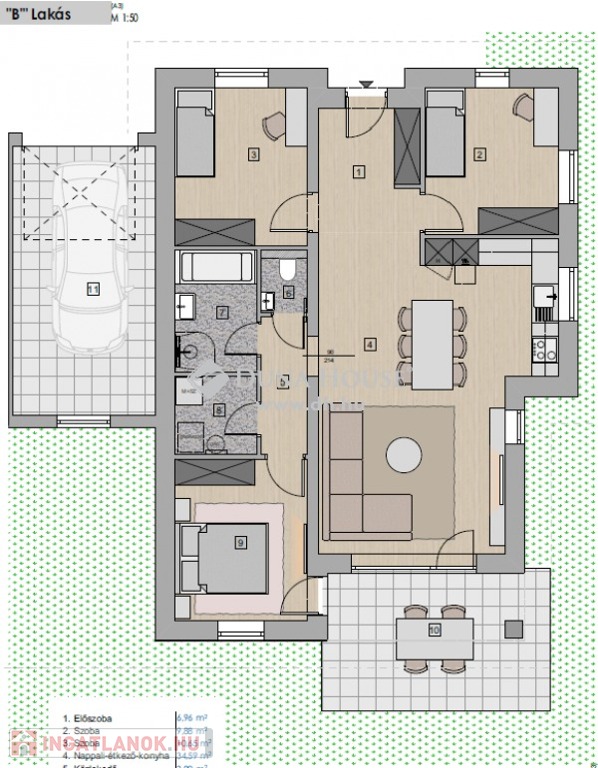 A B épületben 2 lakóépület épül, nappali + 3 szoba + garázs + terasz kialakítással.