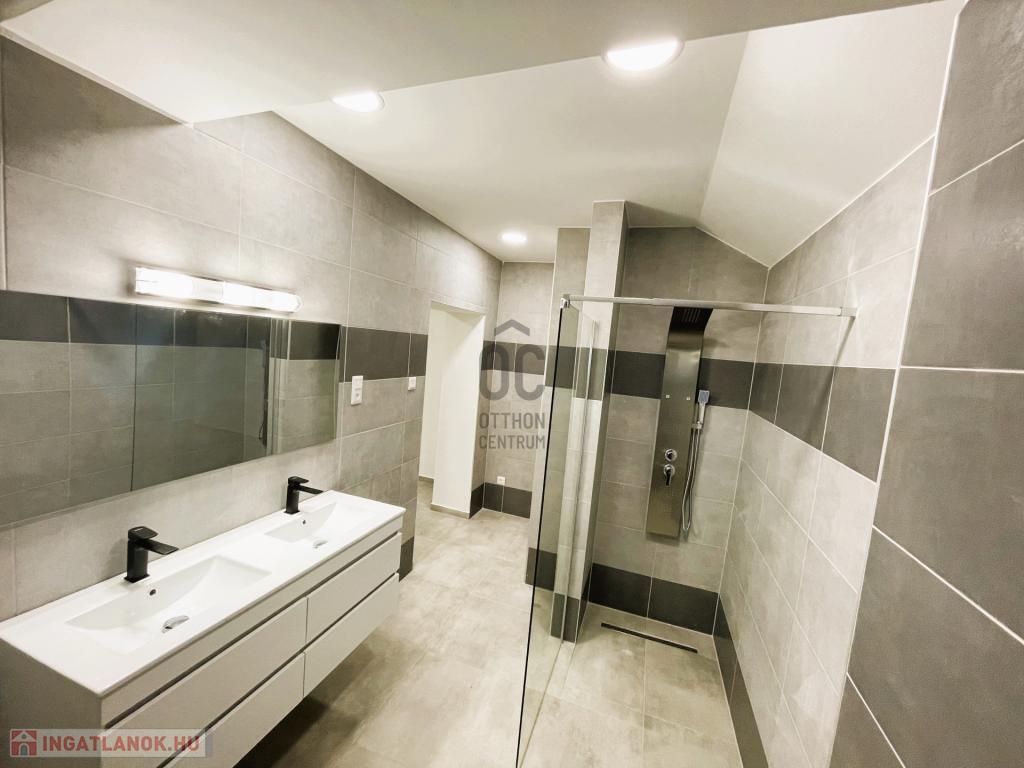 - fürdőszobában dupla mosdókagyló, valamint a térérzetet növelő üveg zuhanyfal található. A fürdőszoba mellett egy külön helyiségben kapott helyet a WC.