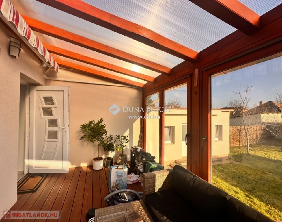 A teraszt hatalmas üvegportállal beépítették így a kapott télikerten keresztül jutunk be a tágas konyha-étkezőbe. Ebből a helyiségből nyílnak a szobák, a fürdőszoba és a mellékhelyiség is.
