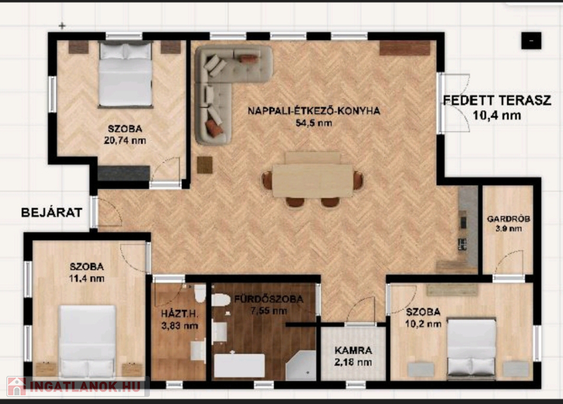 ✅ 3 tágas, világos hálószoba,hatalmas egybenyitott nappali–konyha–étkező tér, valamint praktikus kiszolgálóhelyiségek kapnak helyet.