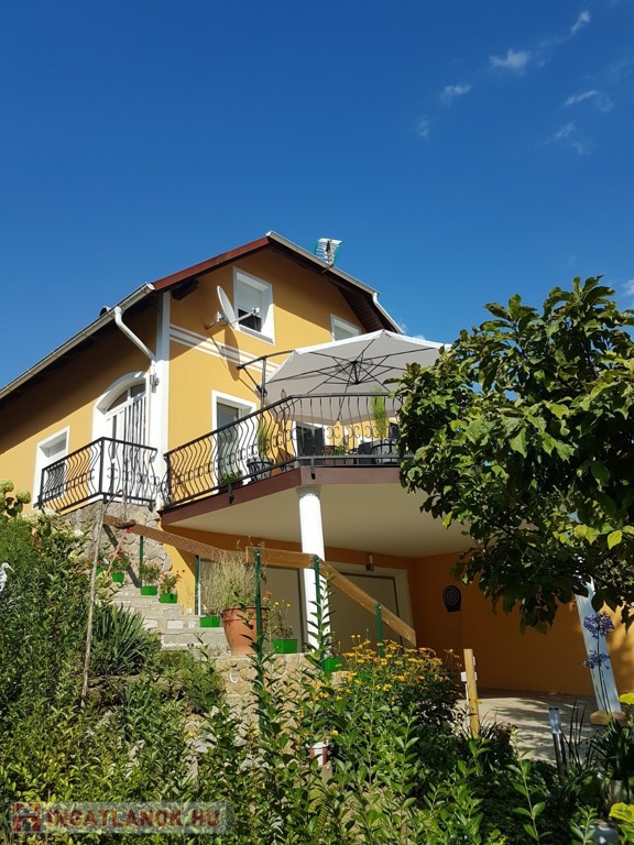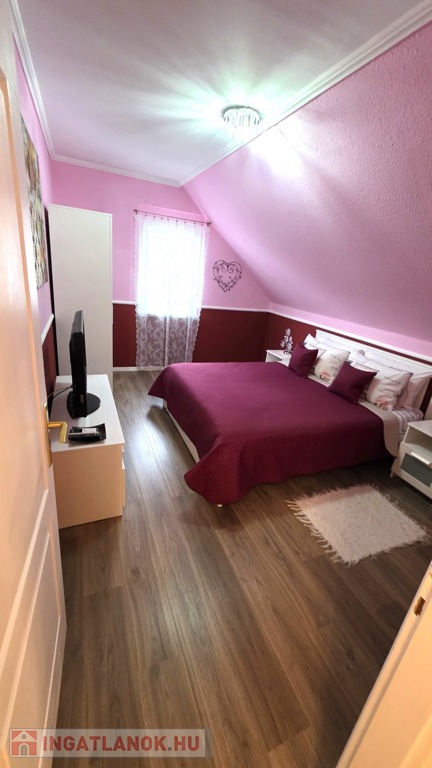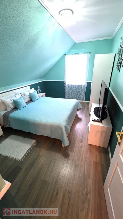 Zala vármegye, Zalakaros 140m2-es családi ház eladó. A közkedvelt zalai fürdőváros csendes utcájában található, a fürdő kényelmes sétával elérhető. A 2000-ben épült, majd felújított, korszerűsített ingatlan garázsszintjén két gépjárműbeálló, tárolók és illemhelyiség, a nagyméretű terasszal rendelkező fogadószinten nappali, konyha étkezővel, hálószoba, fürdőszoba illemhelyiség és közlekedő, míg a lépcsőházból megközelíthető tetőtérben további 3 szoba, konyha (mely szobává visszaalakítható) és közlekedő került kialakításra. A szigetelt családi ház melegéről hűtő/fűtő klíma (6db) gondoskodik. A ház áramellátását napelem rendszer biztosítja. A 700m2-es, parkosított telken gépjárműbeálló, kerti kiülő, szerszámtároló szolgálja az ott élők kényelmét. A tehermentes családi ház szálláshelyként is hasznosítható, erre a szükséges engedélyek, és visszajáró vendégkör is rendelkezésre állnak.
