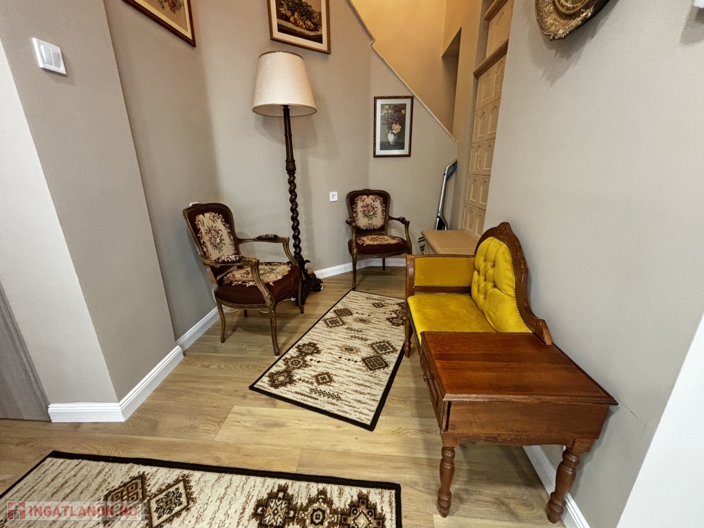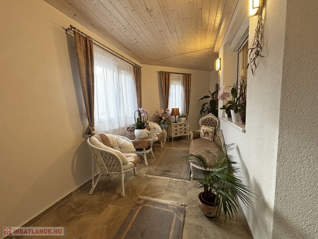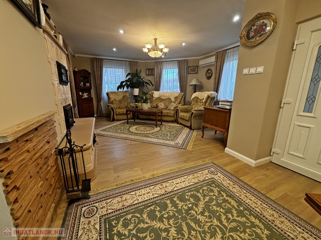 Az igényesen berendezett és folyamatosan karbantartott házon belül a sokszögek, szokatlan módon újraosztják a tereket, így a teljes ház tágas, világos, és úgy izgalmas, hogy közben mégis kényelmet, nyugalmat áraszt. A tágas konyha gépesített, teljes felszereltségű. A fűtést gáz cirkó kazán üzemelteti, valamint egy elegáns törtfehér cserépkályha szolgáltatja a meleget a hidegebb napokon, mely mögött egy én- idő eltöltéséhez alkalmas olvasósarok lett kialakítva. A hőmérséklet továbbá klímákkal is szabályozható. Az emeletre márványlépcső vezet, ezen a szinten is rendelkezésre áll a fürdőszoba és a wc.