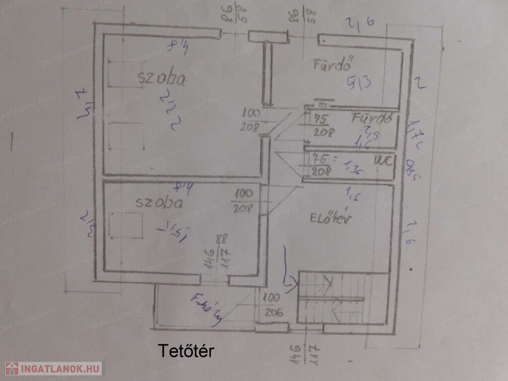 - tetőtér: előtér – társalgó, 2 szoba, fürdőszoba +WC, fürdőszoba, külön WC, erkély