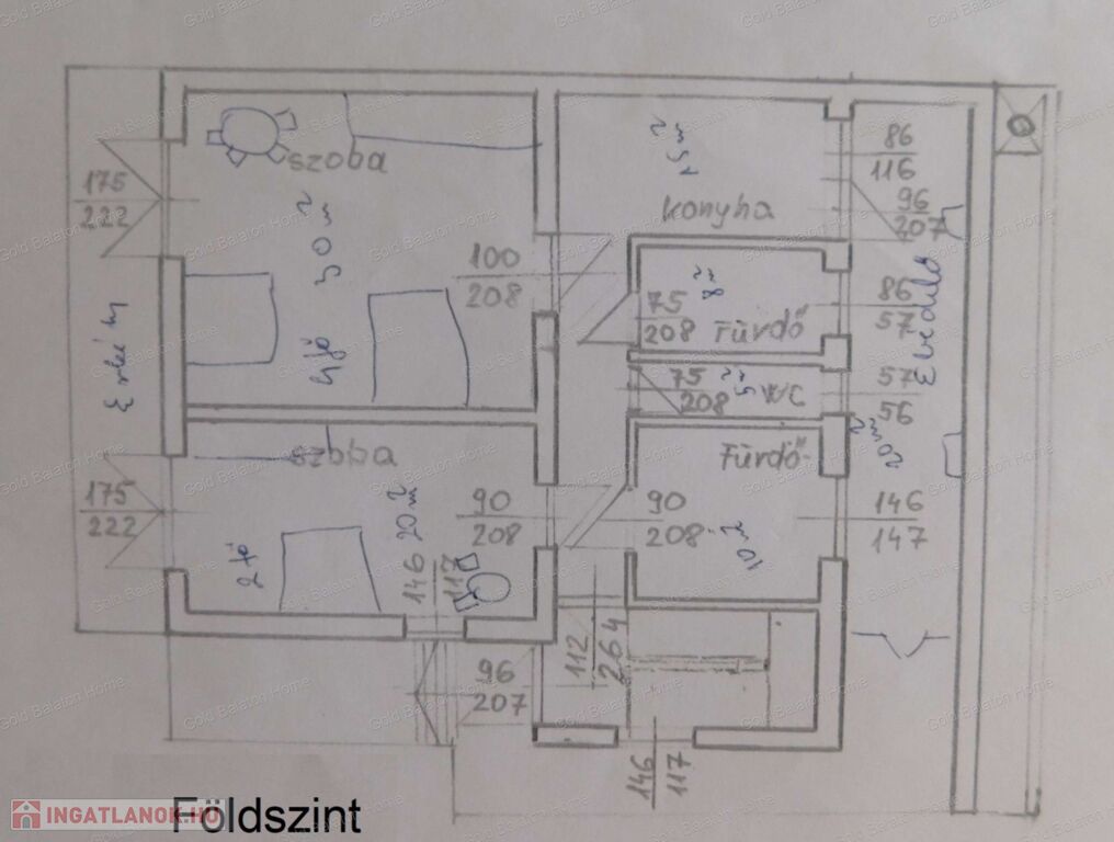 - földszint: lépcsőház, folyosó,tároló a lépcső alatt, 2 tágas szoba, fürdőszoba + WC, fürdőszoba, külön WC, erkély