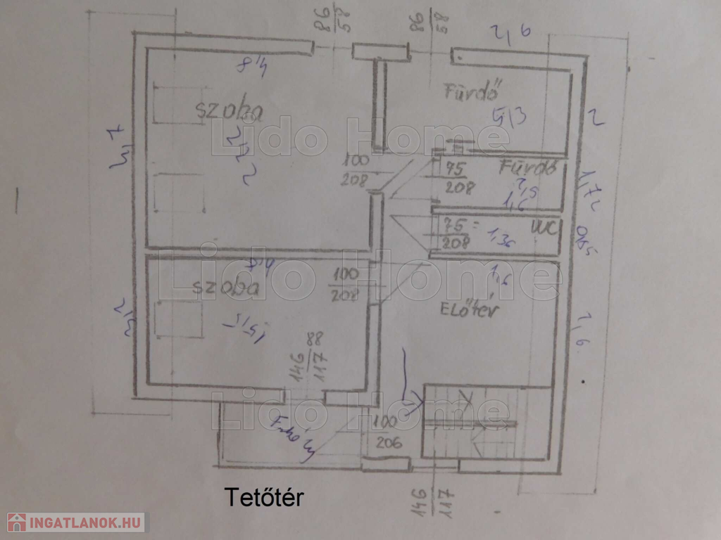 - tetőtér: előtér – társalgó, 2 szoba, fürdőszoba +WC, fürdőszoba, külön WC, erkély