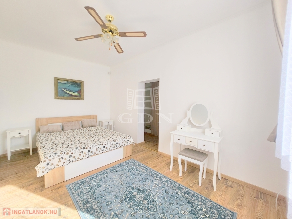 A családi ház kiváló elosztásából adódóan rendelkezésünkre áll egy tágas konyha - étkező, egy 25 m2 nagyságú nappali, mely 3 ablakkal rendelkezik, így nemcsak hangulatos életteret biztosít, de az állandó benapozottsága is garantált. Használhatunk további egy, külön bejáratú hálót, melyhez egy gardróbszoba is tartozik, valamint egy épített zuhanyzóval ellátott fürdőt.