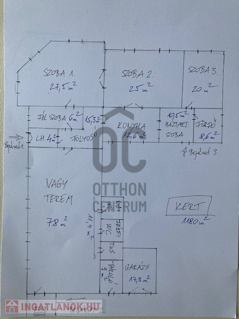 -Az 1180 m2-es telken álló, bruttó 260 m2-es tégla építésű ház felújítandó állapotú.