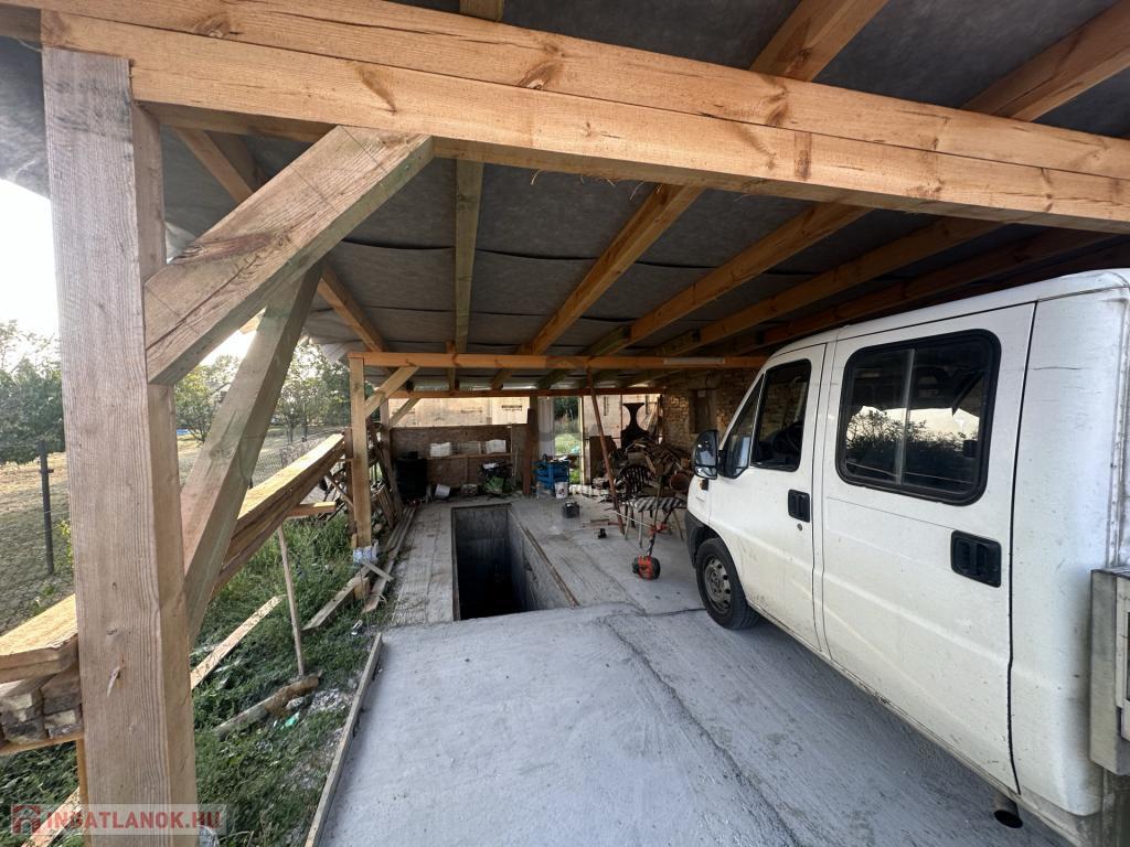 Az épület mellett található egy garázs, egy fedett beálló, amely 2 gépkocsi számára biztosít helyet.