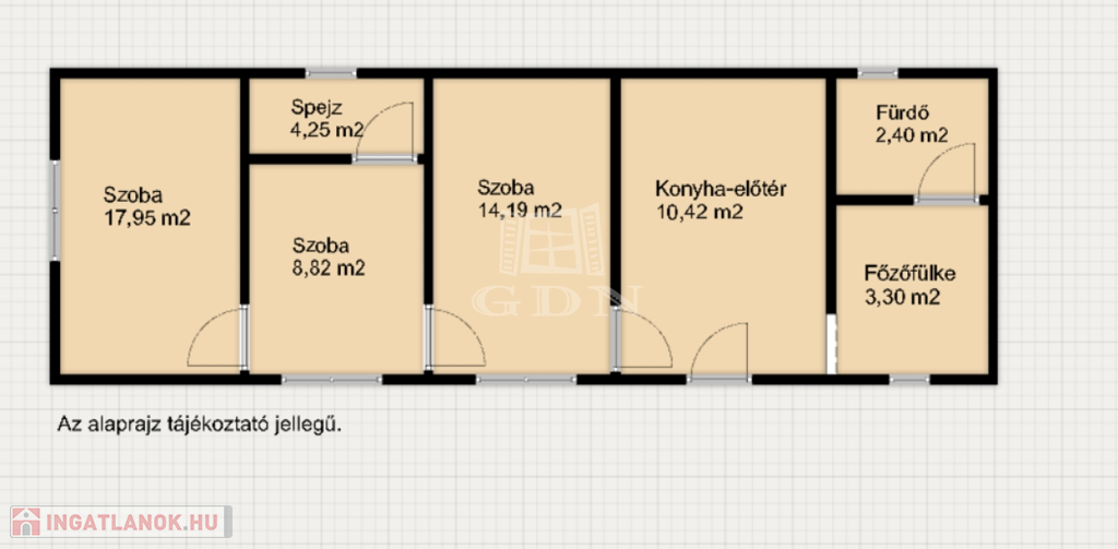 - 62 m2-en ad helyet egy előtér - konyha együttesnek, 3 szobának, egy főzőfülkének, egy spejznek, valamint egy zuhanyzóval és toalettel felszerelt fürdőnek.
