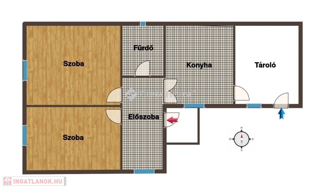 Elosztás: 2 szoba, konyha, kamra, fürdőszoba, előszoba.