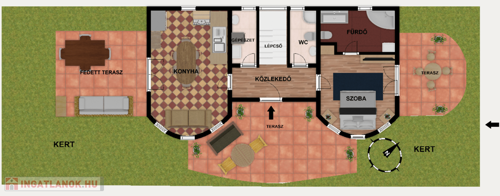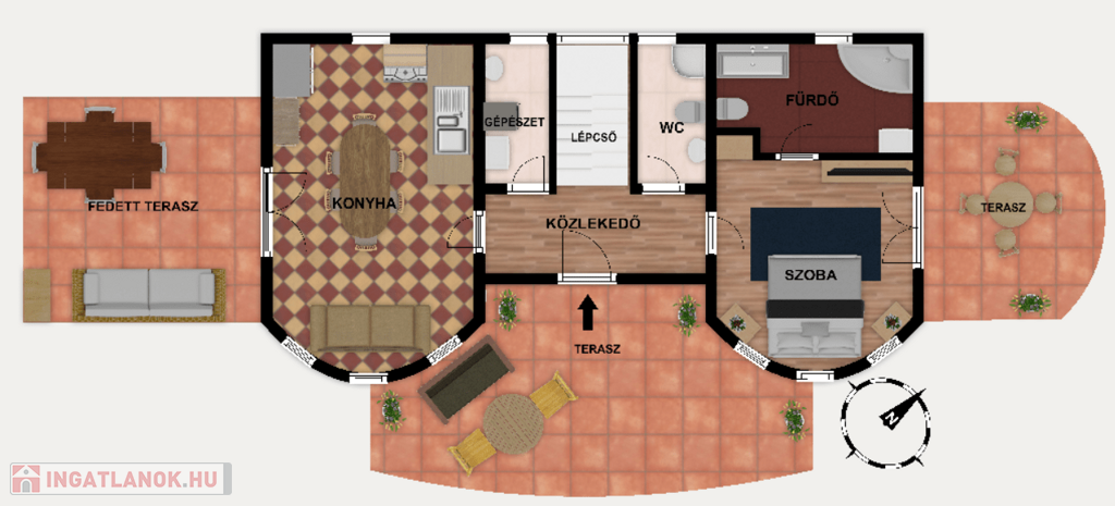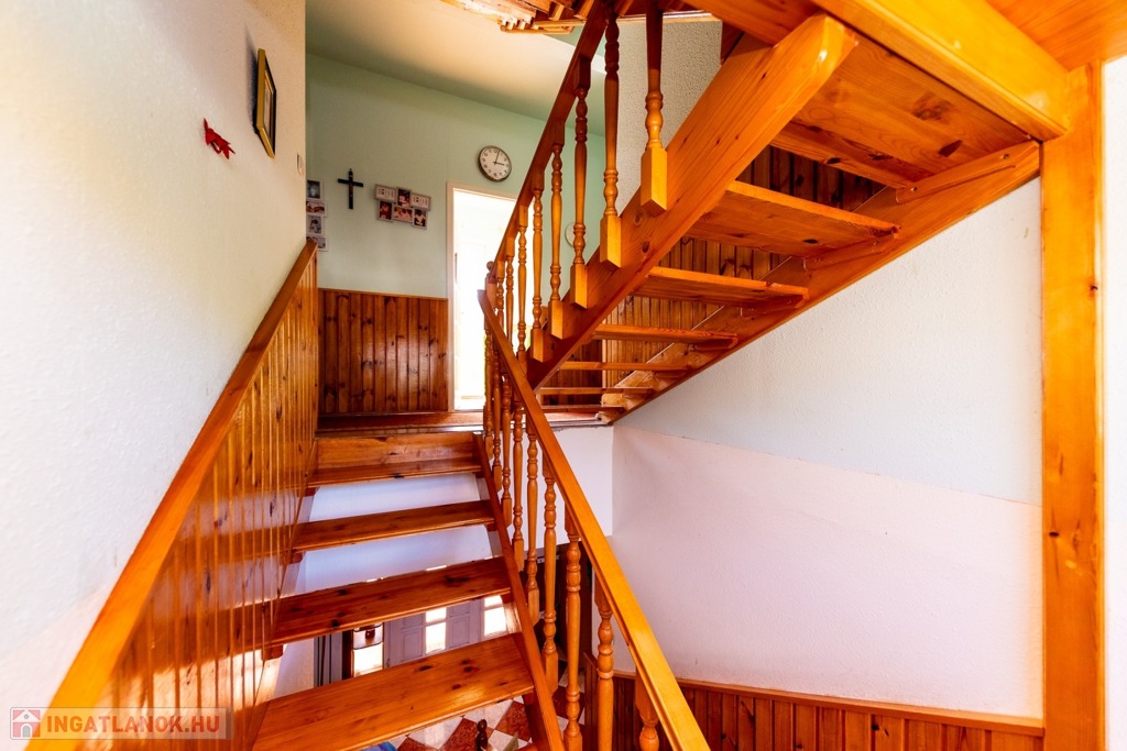 A főépületben a földszinten található egy szülői hálószoba fürdővel, amerikai konyhás nappali, egy zuhanyzós fürdő és 3 terasz, melyekből az egyik fedett.