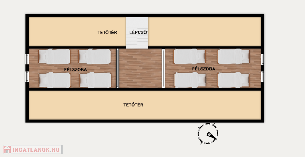 Az emeleten 5 hálószoba, 2 zuhanyzós fürdő és 3 terasz található . A tetőtérben játékszobának vagy tárolónak alkalmas helyiség kapott helyet.