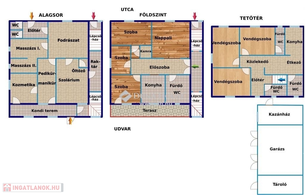 Zirc központjához közel, de mégis egy csendes, erdőhöz közeli utcában eladó egy össz 313nm-s három szintes, lakóházat, vendégházat és szépségipari szolgáltató egységet magába foglaló társasház, 800nm-s telken.