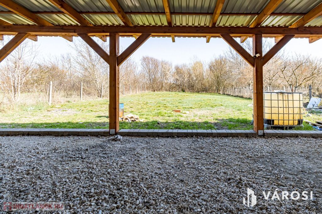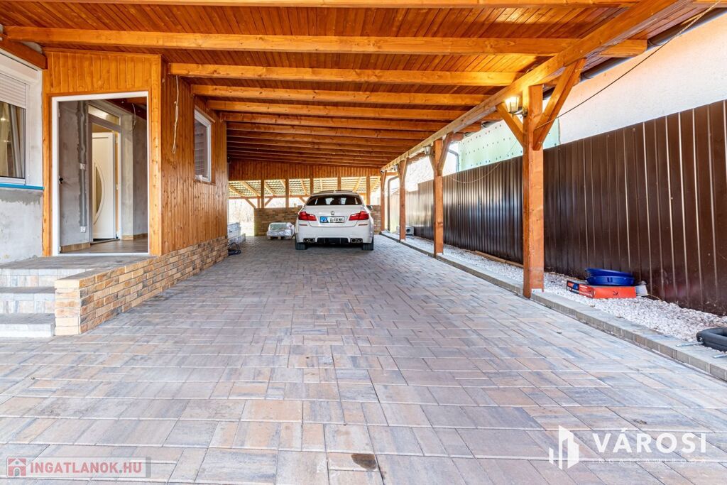 Körbekerített 977 m2-es telekkel, a ház előtt 95 m2-es, térkövezett, fedett autóbeállóval és az épület mögött, hasonló méretű, további fedett terasz előkészítéssel.