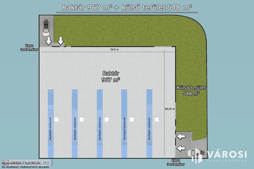 • A csarnok 2 oldalról megközelíthető, 2 oldalról rakodható 3×3 méter magas szekcionált ipari kapun