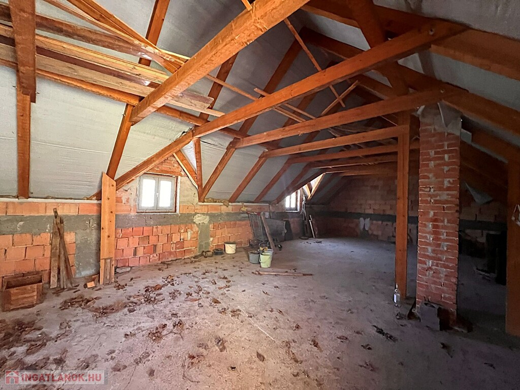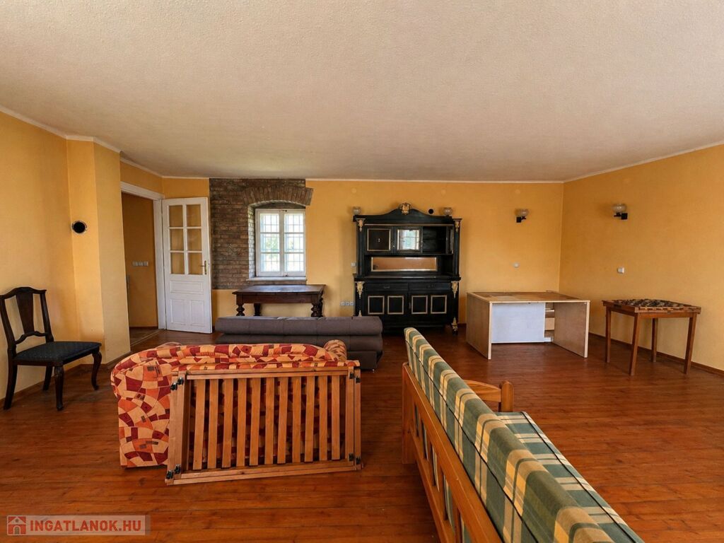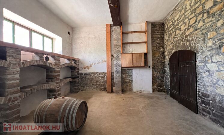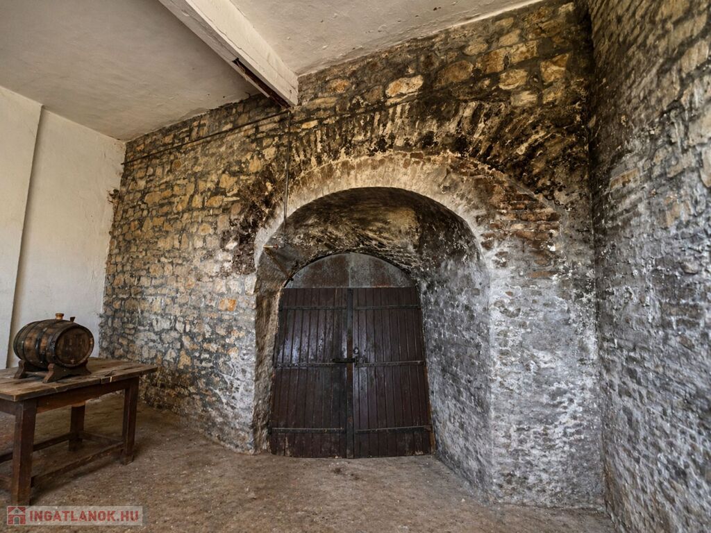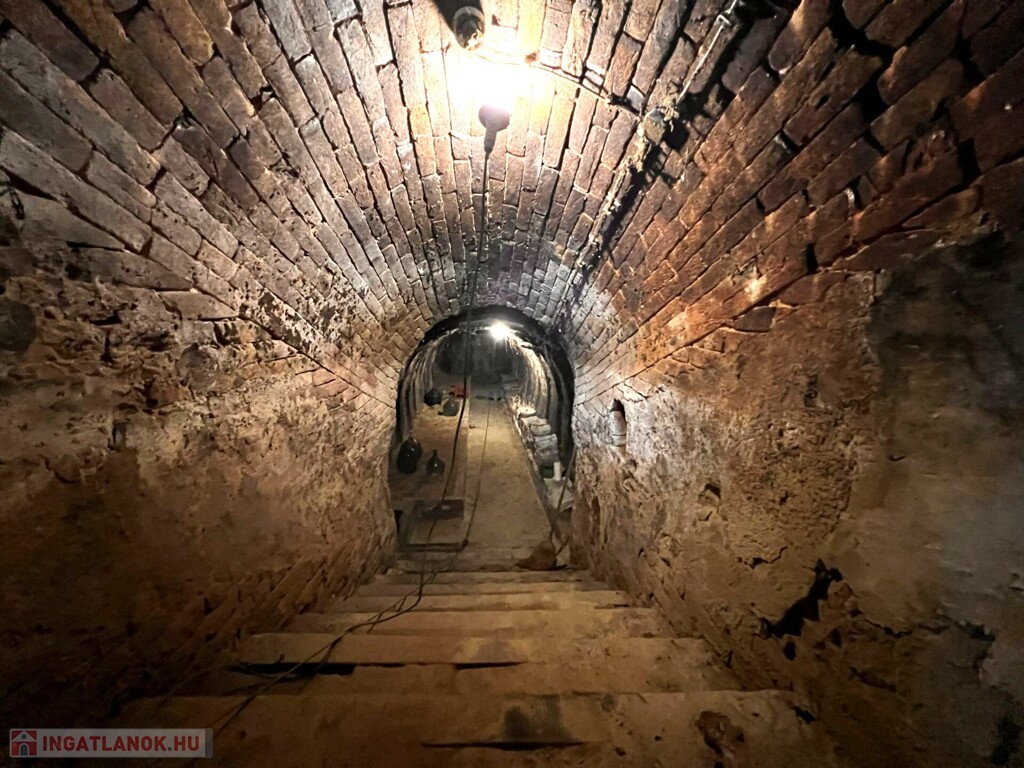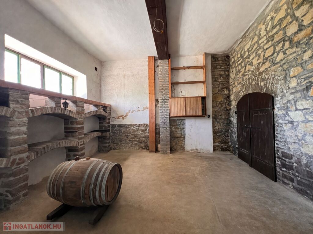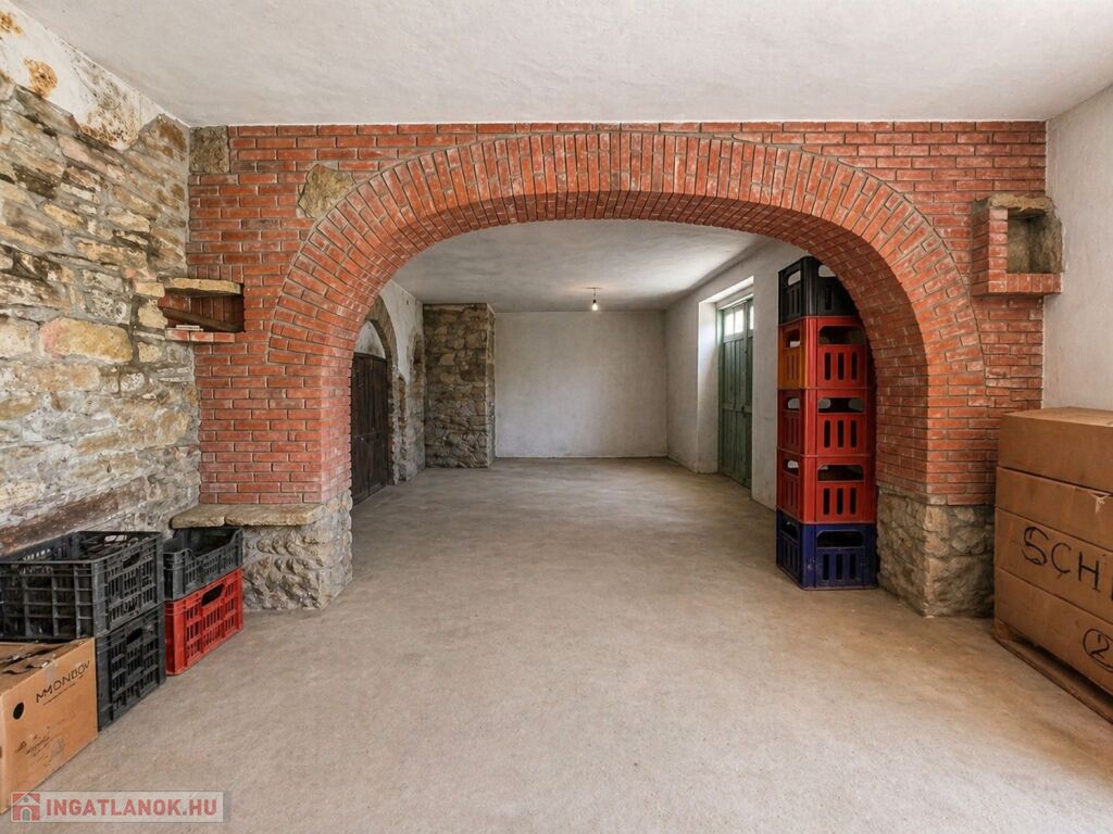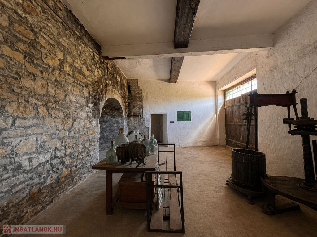 Az épület mellett található a későbbi, 100 m2- es, téglából készült rész, amely már szerkezetében is a nagyobb volumenű hasznosítást támogatja. Itt a földszinten két nagy méretű terem áll rendelkezésre, valamint két lenyűgöző, téglaboltíves pinceág, amelyek közül az egyik jelenleg beszakadt állapotú, de kitisztítva és helyreállítva különleges értéket képviselhet. Az ingatlan különlegessége, hogy a két épületrész belül, egy folyosón keresztül is összeköttetésben áll, így egységes, jól átlátható és könnyen használható teret alkotnak, ami kiválóan alkalmas például borkóstolók vagy tematikus rendezvények lebonyolítására. A helyiségek között megtalálható még egy feldolgozó szoba, két mellékhelyiség és egy tároló is. A tetőtér beépítése már elkezdődött, összesen mintegy 110 m²-en kínál további bővítési lehetőséget, amely kiváló alap lehet szobák vagy apartmanok kialakításához.