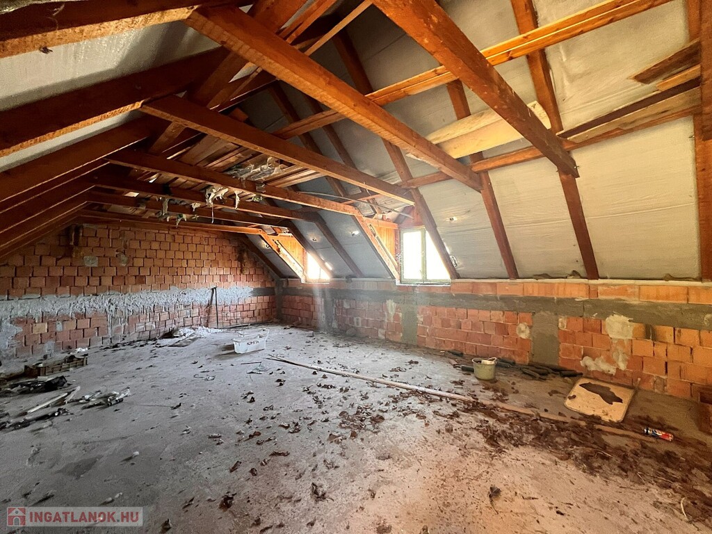 A mintegy 70 m²-es emelet külső lépcsőn közelíthető meg, ahol egy közlekedőből nyílik a fürdőszoba, a konyha étkezővel, valamint egy tágas nappali. Ez a szint ideális lehet lakórész kialakítására, de vendégek fogadására is kiválóan alkalmas.