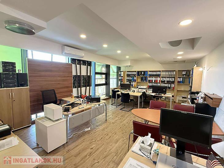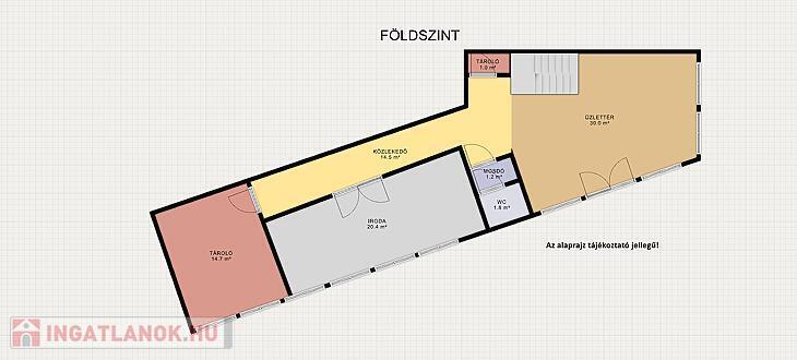 A magasföldszinten beérkezve egy üzlettér található konyhával és egy lépcsőház. Az emeleten, iroda fürdőszoba mellékhelyiséggel., A földszinten pedig 1 irodahelyiség 1 tároló és egy fürdőszoba.