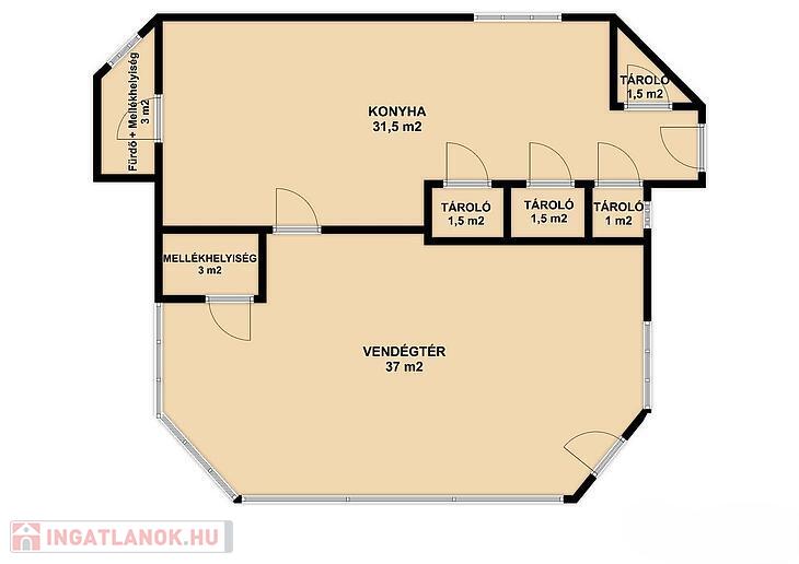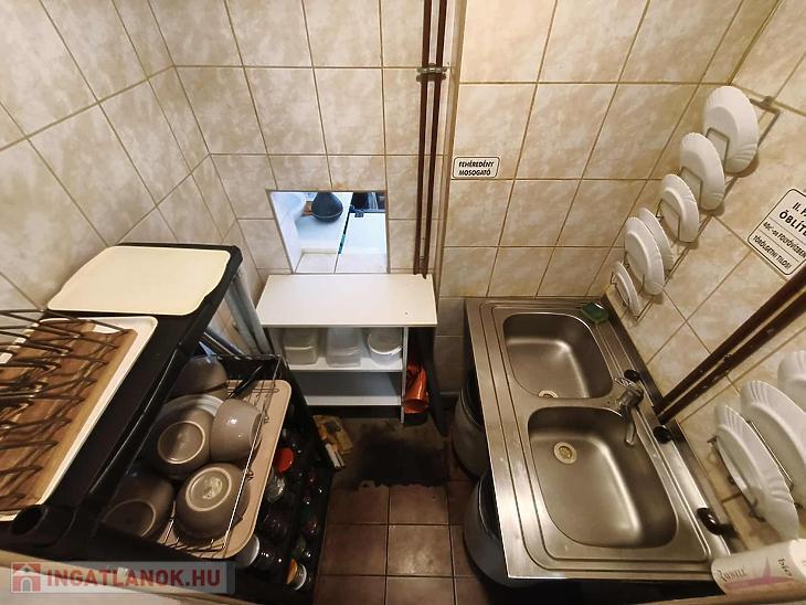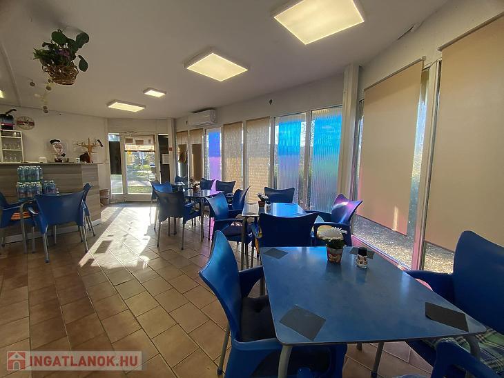 vendég tér, 4 tároló helyiség, konyha, vendég mosdó, személyzeti zuhanyzó + mellékhelyiség.