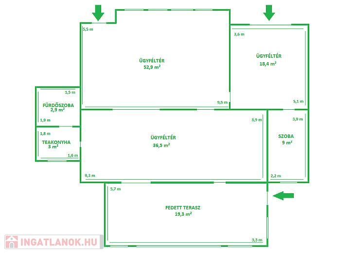 Főépületben 3 db, nagyméretű ügyféltér, szoba, konyha, zuhanyzós fürdőszoba, valamint beépített terasz található. A telken fedett tároló szerelőaknával és több gépkocsi számára tároló, valamint 50 m² pince rendelkezésre áll.
