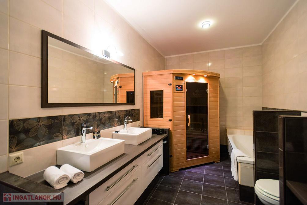 - wellness egység beltéri élménymedencével, finn-, gőz- és infraszaunával, merülő medencével, relax helyiséggel, szoláriummal, masszázsszobával, férfi- női öltözővel