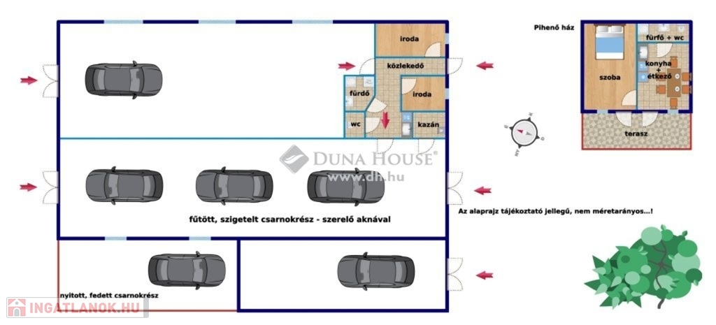 A középső (140m2-es ) csarnokrész körbe szigetelt, fűtött, 14 m hosszú szerelőaknával van kiépítve. Irodák, teakonyha, fürdő és wc is van kialakítva. A telek hátsó felén található egy 30 m2-es könnyűszerkezetes lakható pihenőház, konyhával és fürdővel. A telephely tűzívíztárolóval és saját kúttal is rendelkezik.