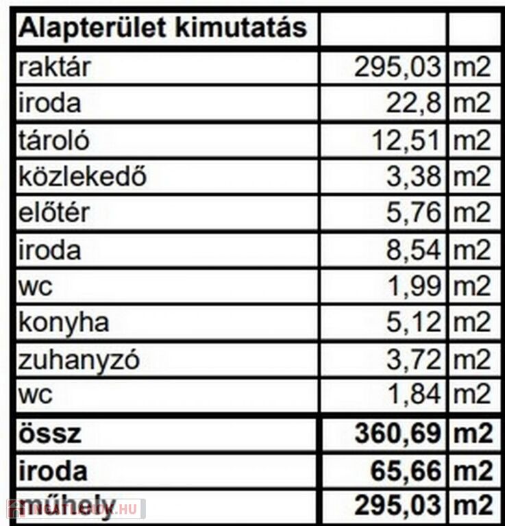 - Gyártó/raktár csarnok/műhely: 295 m2