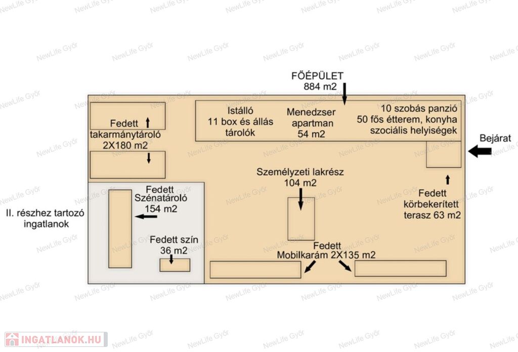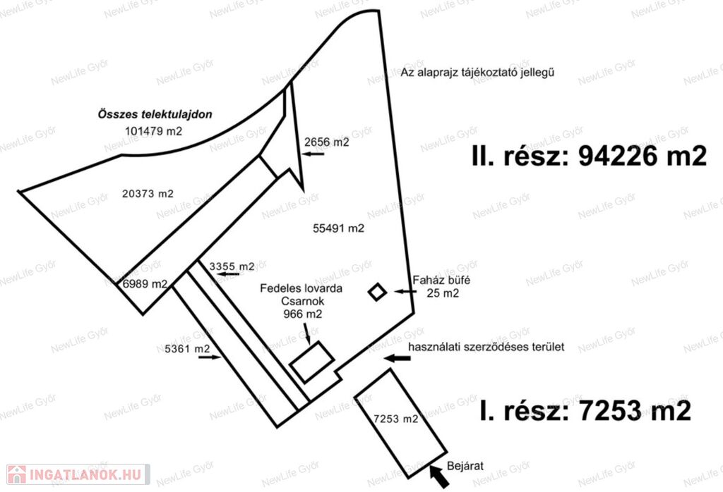 II. rész irányára: 380MFt, mely hatalmas területet: 94226 m2 telekrészt tartalmaz, illetve a 966 m2 területű, acél vázszerkezetű fedeles lovardát továbbá többek között szénatárolót, fedett kis istállót.