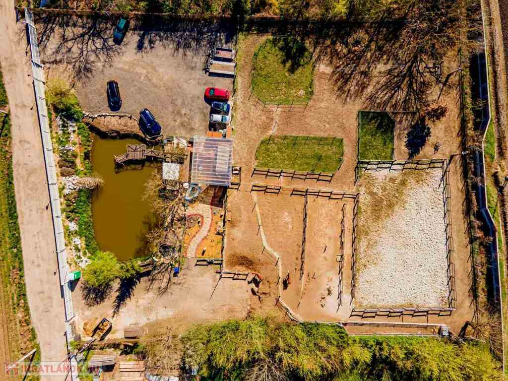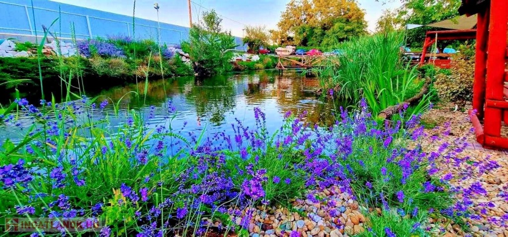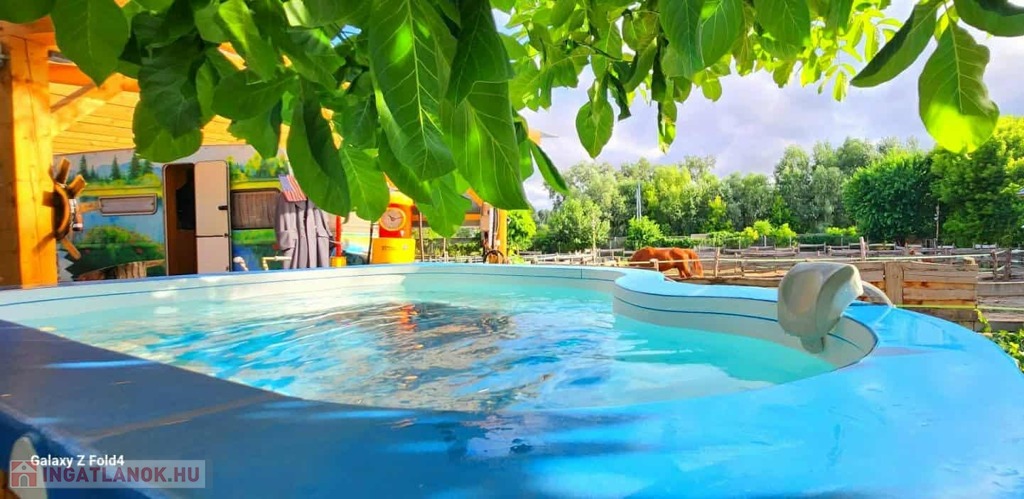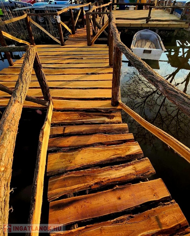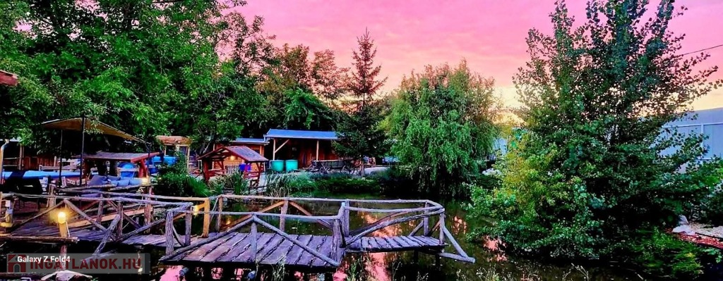 Halastó (20×40 m, 2–2,5 m mély), stég, terasz, medence