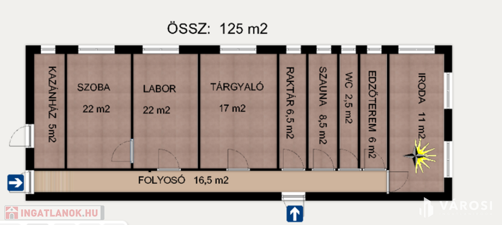 Helyiségek: szoba, labor, tárgyaló, iroda, wc, tusoló, edzőterem, szauna, konyha, étkező.
