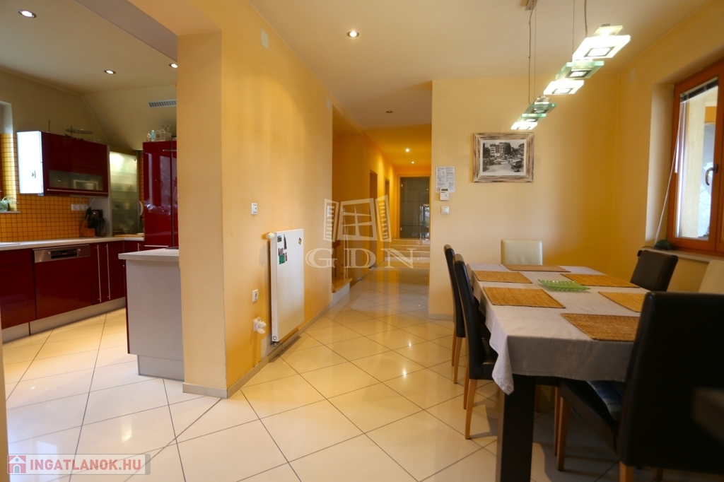 az emeleten négy világos hálószoba kapott helyet, valamint egy zuhanyzós fürdőszoba és egy különálló vizes helyiség is szolgálja a kényelmet. Ugyanitt található a garázs felett kialakított, 60 m²-es beépítésre előkészített tetőtér, amely akár egy külön bejáratú lakássá is átalakítható – ideális többgenerációs együttéléshez vagy irodai funkcióra.